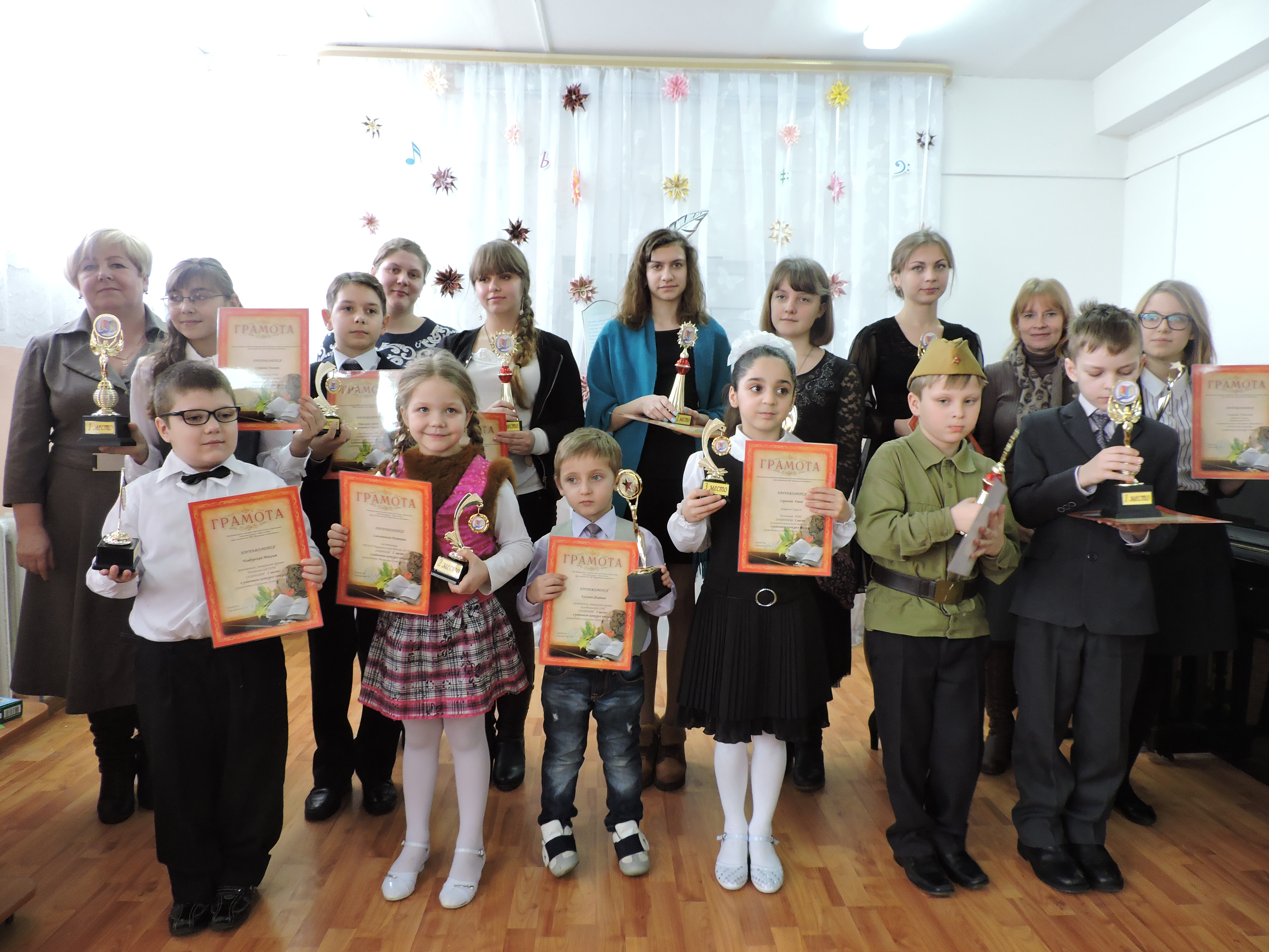 Итоги конкурса Юных чтецов посвященного писателям поэтам-юбилярам 2016 года:А. Майкову, Н. Некрасову, М. Джалилю, А. Барто, М. Булгакову, Е. Чарушину, А. Рыбакову. Победители: ВОЗРАСТНАЯ КАТЕГОРИЯ: ДОШКОЛЬНЫЕ ГРУППЫ ШКОЛ И ДЕТСКИЙ САД 1 место «Ахлебининская СОШ» - Касимов Флавиан, А. Барто «Снегирь», руководитель Сакулина Светлана Петровна 2 место МКОДОУ Перемышльский детский сад «Радуга» - Смольянинова Виктория, А. Барто «Медвежонок Невежа», руководитель Малявская Елена Александровна 3 место МКОУ «Погореловская ООШ», дошкольная группа - Чембурский Максим, А. Барто, «Гуси – лебеди», руководитель Качанова Елена Валерьевна ВОЗРАСТНАЯ КАТЕГОРИЯ: 1-4 КЛАССЫ 1 место МКОУ «Ахлебининская СОШ» - Ракчеев Иван, Е. Чарушин «Никита – доктор», руководитель Ларикова Ирина Дмитриевна 2 место МКОУ «Сильковская ООШ», - Красин Максим М. Джалиль «Волки» Жаркова Вероника Омаровна 3 место МКОУ «Козловская СОШ» - Сарангян Гаяне, А.Барто «По дороге в класс», руководитель Слабова Оксана Александровна ВОЗРАСТНАЯ КАТЕГОРИЯ: 5-8 КЛАССЫ 1 место МКОУ «Сильковская ООШ» - Суханова Эльвира, А. Барто «Первая любовь», руководитель Жаркова Вероника Омаровна 2 место МКОУ «Перемышльская СОШ» -Дорохина Анастасия, М. Джалиль «Чулочки», руководитель Разоренова Оксана Владимировна 3 место МКОУ «Ахлебининская СОШ» - Суржиков Сергей, Н. Некрасов «Поэту», руководитель Лукина Елена Ивановна 3 место МКОУ «Перемышльская СОШ» - Филиппенкова Полина, Н.Некрасов «Ведьмы», руководитель Николаева Валентина Михайловна ВОЗРАСТНАЯ КАТЕГОРИЯ: 9-11 классы 1 место МКОУ «Перемышльская СОШ» - Евтодьева Екатерина, отрывок из романа М. Булгакова «Мастер и Маргарита», руководитель Николаева Елена Васильевна 2 место МКОУ «Покровская ООШ» - Бондаренко Дария, М. Джалиль «Варварство», руководитель Горкина Евгения Александровна Кубок за авторское исполнение МКОУ «Ахлебининская СОШ» - Алешина Татьяна, «Сергей Есенин» Все участники конкурса отмечены сертификатами участников, Победители – Дипломами Победителей и кубками.